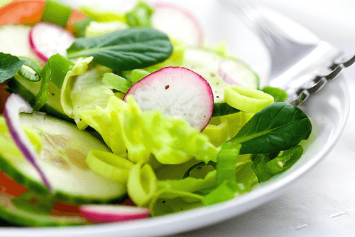 Редис, листья салата, петрушку и лук перемешайте и переложите в салатник. Украсьте блюдо половинками яйца.