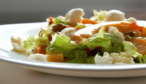 В большой миске смешайте листья салата с нарезанными дольками персиками. Сбрызните заправкой и аккуратно перемешайте.