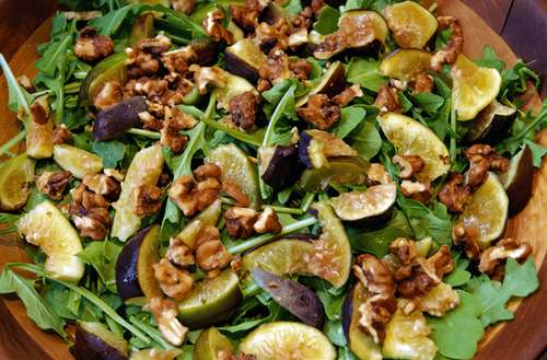 На 4 тарелки выложите салатные листья, на них тонко нарезанный полукольцами красный лук, тонко нарезанный инжир и посыпьте грецкими орехами и кусочками прошутто.