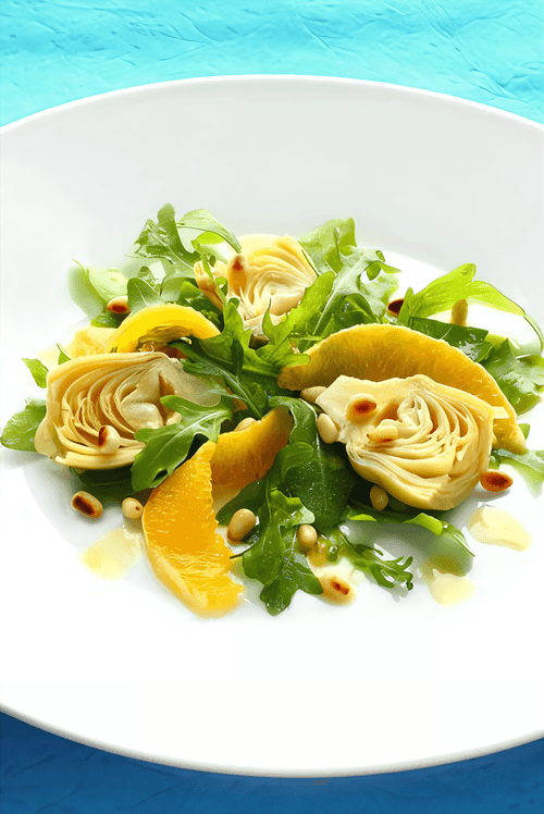 Этот элегантный французский салат — настоящая симфония вкусов, соединяющая нежность артишоков, сочность апельсинов и пикантность руколы. Артишок, любимый французами за его тонкий вкус и утонченность, здесь прекрасно сочетается с яркой цитрусовой свежестью апельсина. Заправка из оливкового масла, лимонного и апельсинового соков, дополненная сладковато-острым луком-шалотом, делает блюдо гармоничным и выразительным. Легкие, хрустящие кедровые орешки придают салату нотку ореховой глубины. Этот салат идеален для легкого летнего ужина или элегантной закуски, подчеркивая мастерство французской гастрономии в создании простых, но изысканных сочетаний вкусов.