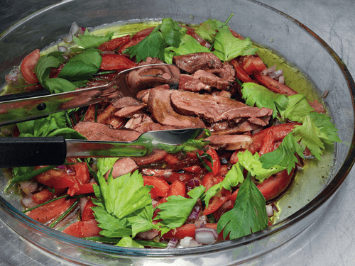 Говядина с томатами, базиликовым маслом и листьями сельдерея