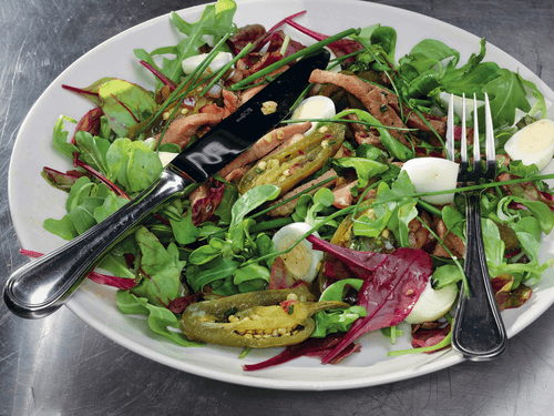 Свинину нарезать тонкими ломтиками, перцы разрезать на половинки. Смешать салатные листья с соусом, сверху выложить яйца, свинину, перцы и посыпать крупно нарезанным зеленым луком.