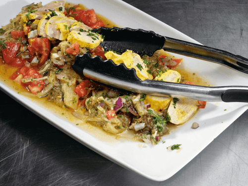 Достать готовую грудку, нарезать ломтиками и выложить на баклажаны с помидорами или перемешать с ними.