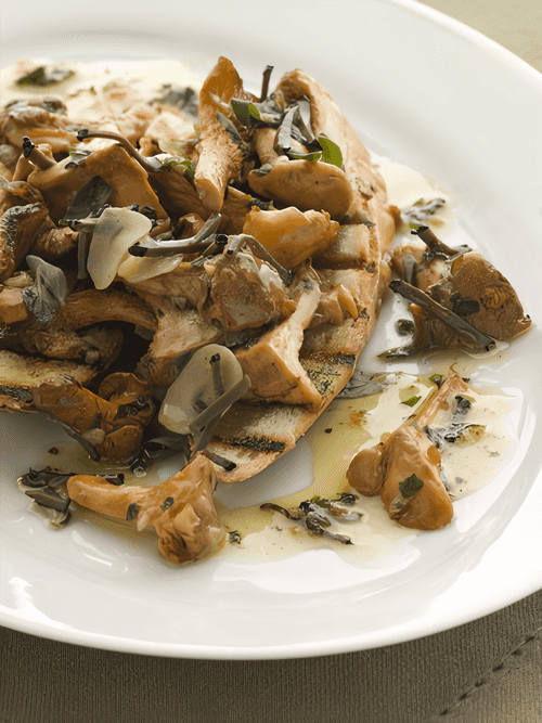 В сковороде разогрейте оливковое масло и обжарьте тонко нарезанный чеснок и мелко нарезанный чили до мягкости. Добавьте грибы и готовьте, пока они хорошо не разогреются. Посолите и поперчите по вкусу, добавьте зелень, сбрызните лимонным соком и сразу подавайте.