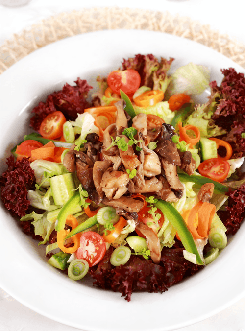 Грибной салат с соусом терияки, козьим сыром и кунжутом