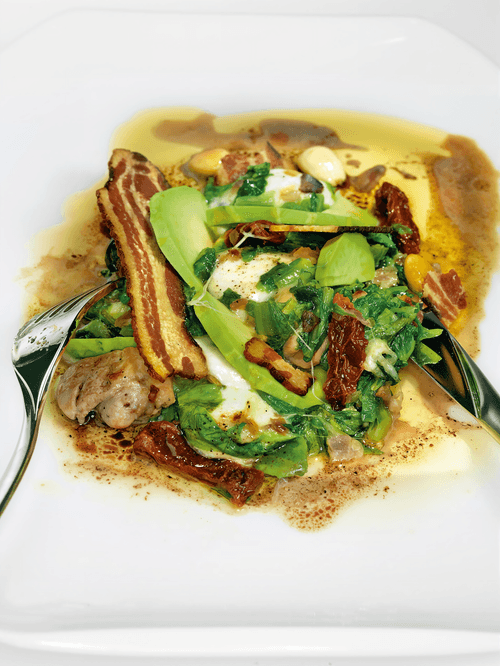 Добавить авокадо и тут же подавать, полив соусом.