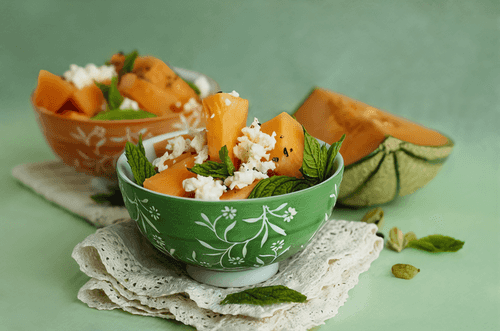 В миске смешайте 4 стакана нарезанной мякоти дыни, мелко нарезанный красный лук, раскрошенную фету, мяту, оливковое масло и сок лайма. Посолите и поперчите по вкусу и аккуратно перемешайте.