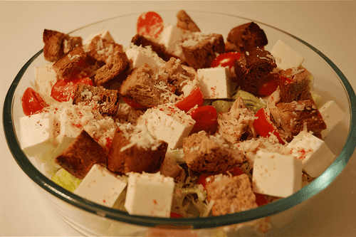 Салатные листья положить на тарелку. Сверху положить фету, затем куриную грудку, черри и сухари. Посыпать все тертым пармезаном. Посолить, поперчить.