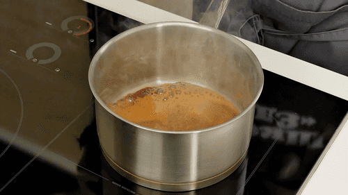 Сахар всыпать в глубокий сотейник и поставить на сильный огонь. Помешивая венчиком, довести до состояния жидкой коричневой карамели.