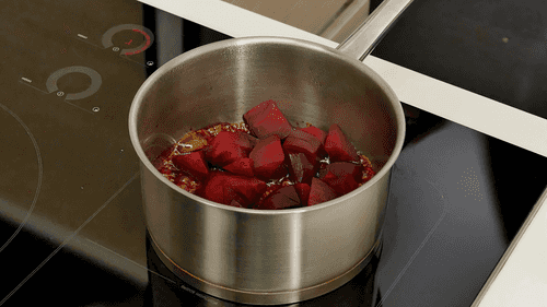 Добавить винный уксус, две столовые ложки воды и щепотку соли. Довести смесь до однородного состояния. Положить в карамель свеклу и, помешивая, покрыть карамелью.
