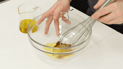 Взболтать венчиком смесь из меда, бальзамического уксуса и одной столовой ложки оливкового масла. Добавить горчицу и взбить венчиком, постепенно вливая 100 мл оливкового масла. Приправить солью по вкусу.