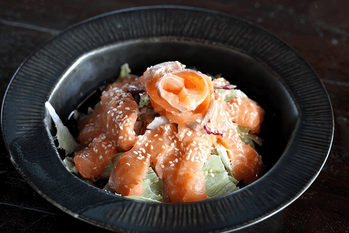 Зеленый салат с копченой форелью, каперсами и заправкой из хрена