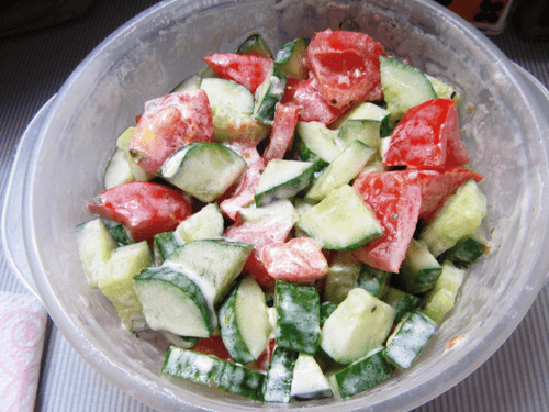 Порезать огурцы, помидоры и перец по своему усмотрению.