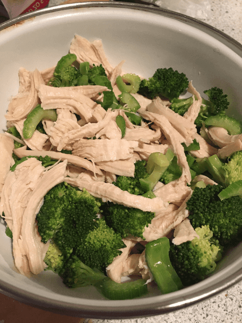 Смешиваем курицу и брокколи, добавляем тертый сыр и выдавленный чеснок. Солим и заправляем майонезом по вкусу.