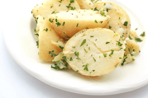 Разрежьте небольшие картофелины пополам или на 4 части и отварите в подсоленной воде до готовности. Слейте.