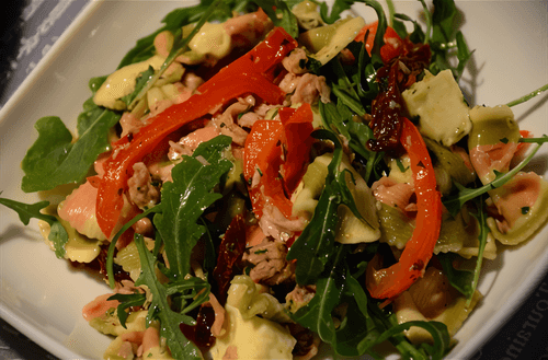 Итальянский салат с пастой, тунцом и вялеными томатами