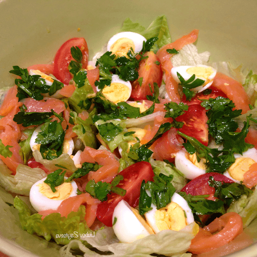 Салат с перепелиными яйцами, семгой и томатами черри