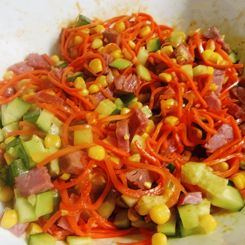 Салат с морковью по-корейски — это яркое и пикантное блюдо, которое сочетает в себе сладость кукурузы, остроту пряной моркови и насыщенность копченой колбасы. Его основа — морковь по-корейски, популярная закуска, пришедшая в русскую кухню благодаря корейским переселенцам. Лёгкий хруст огурцов добавляет свежести, а картофельные чипсы создают приятный контраст текстур. Заправленный майонезом, салат приобретает нежность и гармонию вкусов. Этот салат отлично подходит для праздничного стола благодаря оригинальной подаче в виде «ромашки». Он не только радует глаз, но и насыщает, оставляя приятное послевкусие. Простой в приготовлении, он станет изюминкой любого застолья, сочетая в себе традиции и современный взгляд на русскую кухню.