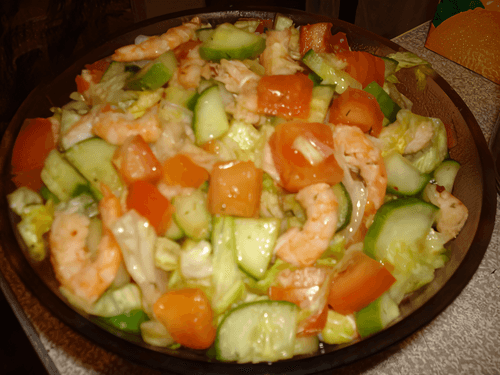 К овощам выложить креветки, вместе с соусом, перемешать, дать настояться минут 10–15, подавать на стол.
