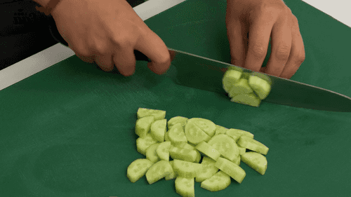 Огурцы тщательно очистить от кожи и нарезать крупными полукруглыми ломтиками. Сложить в глубокий салатник или широкую миску, в которой будет удобно смешивать.