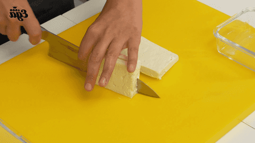 Твердую фету нарезать острым ножом на прямоугольные ломтики толщиной в 1 см. Чтобы сыр не прилипал к лезвию, нож можно предварительно окунуть в теплую воду.