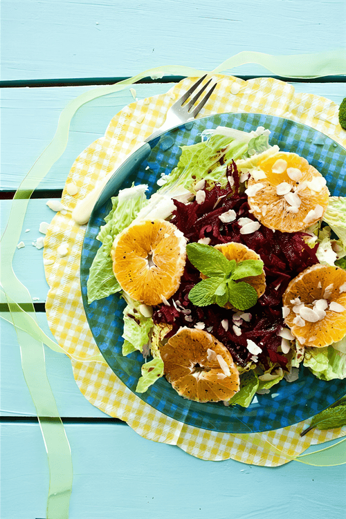 Этот салат — воплощение свежести и гармонии вкусов. Свекла, известная своими сладковатыми и землистыми нотками, прекрасно сочетается с сочным апельсином, создавая контраст вкусов и текстур. Листья салата ромен придают блюду хрустящую основу, а свежая мята добавляет освежающий аромат. Заправка на основе оливкового масла и винного уксуса мягко подчеркивает основные ингредиенты, а миндальные хлопья привносят легкую ореховую нотку. Европейские кухни славятся своим умением использовать простые, но изысканные сочетания, и этот салат — отличный тому пример. Он идеально подходит для легкого летнего ужина, гармонично дополняет блюда из рыбы или белого мяса, а также служит превосходным самостоятельным угощением, пробуждающим аппетит.