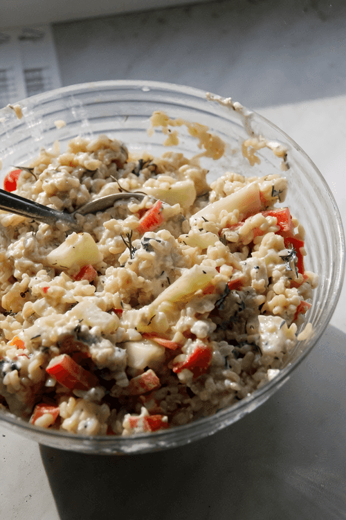 Булгур прекрасно подходит для приготовления салата, который требует присутствия множества свежих ингредиентов, среди которых особенно акцентируется внимание на хрустящем свежем огурце.