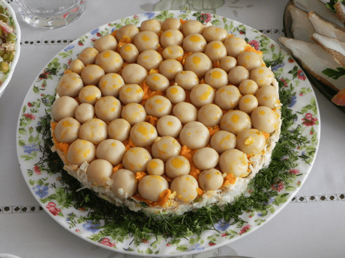 Слоеный салат с грибами, мясом и плавлеными сырками