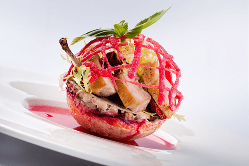 Салат с перепелом — утонченное сочетание вкусов, рожденное в европейской гастрономии. Этот изысканный блюд объединяет нежное мясо перепела, пропитанное куриным бульоном и сливочным маслом, с яркими нотами бланшированного яблока и чернослива. Слоистая структура салата, в которой гармонично сочетаются тертый картофель с мускатным орехом, сладкая морковь и пикантная свекла, придает ему насыщенность. Вяленые помидоры и салат фризе добавляют свежести, а масло фундука завершает вкусовую композицию ореховым оттенком. Декорированный свекольными чипсами и веточкой базилика, этот салат — не просто блюдо, а произведение кулинарного искусства, подходящее для особых случаев и гурманов, ценящих многослойные текстуры и глубокий вкус.