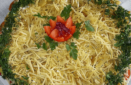 Слоеный салат с картофелем, карбонадом и сыром