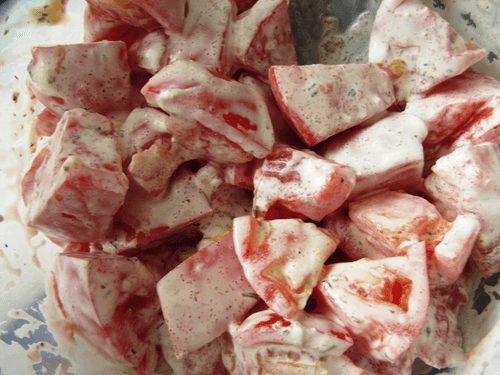 Заправить помидоры сметаной и зеленью, аккуратно перемешать, чтобы из помидор не выделился лишний сок.