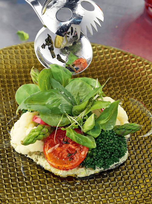 Имбирно-чесночный соус вылить на тарелку, выложить отваренные овощи, редис, томаты и зелень. Полить 20 мл масла, посолить и поперчить по вкусу.