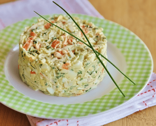 Крабовый салат с огурцом и зеленым луком — это легкое и изысканное блюдо европейской кухни, которое отлично подойдет для праздничного стола или повседневного ужина. Сочетание нежных крабовых палочек, свежего хрустящего огурца и ароматного зеленого лука создает гармонию вкусов, дополненную бархатной текстурой вареных яиц и мягкостью майонеза. Этот салат известен своей освежающей легкостью и приятным морским оттенком, что делает его прекрасным дополнением к летним меню. Традиционно подается в аккуратной форме с металлическим кольцом, что придает ему элегантный вид. Идеально сочетается с белым вином и свежим багетом, а зелень укропа добавляет пикантности и свежести. Уникальный баланс вкусов делает этот салат универсальным выбором как для торжественных мероприятий, так и для быстрого домашнего угощения.