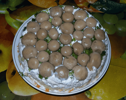 Далее выкладываем грибы, шляпками вниз, сверху посыпаем нарезанной зеленью (я чаще всего использую зеленый лук и укроп, в принципе можно положить любую зелень, какую душа пожелает). Промазываем слой майонезом.
