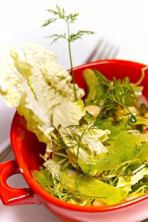 Нарежьте редьку — лучше всего овощечисткой, так у вас получатся тонкие, полупрозрачные «перья». Редис нарежьте потоньше обычным ножом, добавьте к ним фасоль, кресс и мелко порванные листья капусты.