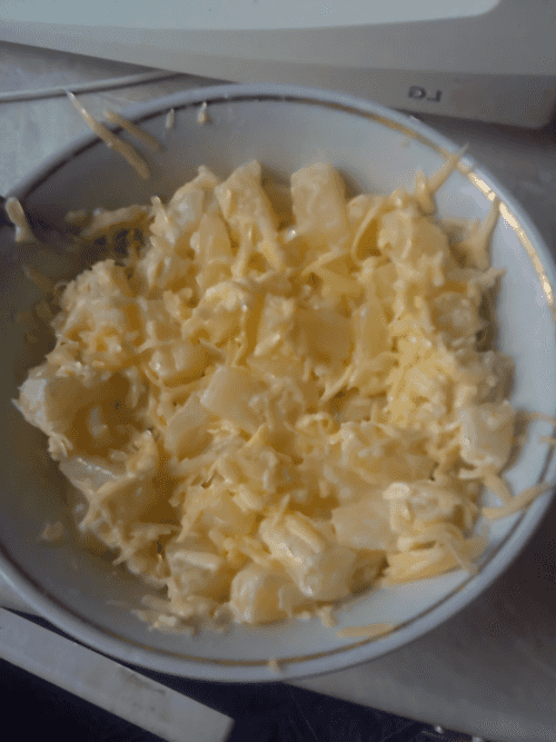 Смешать сыр и ананасы.