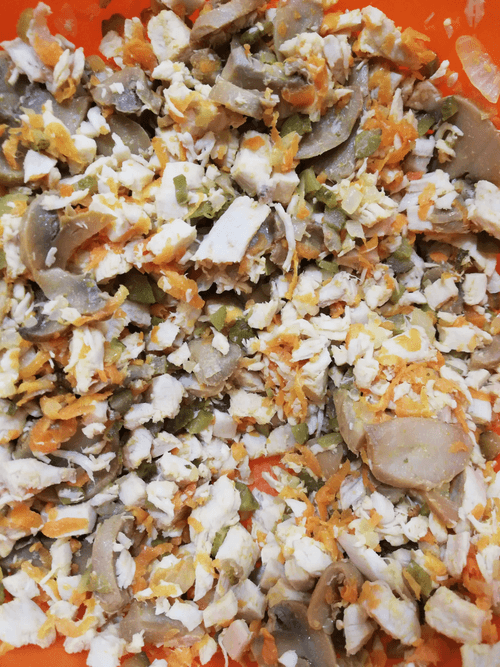 Когда курица и поджарка остынут, все смешать, посолить и заправить майонезом.