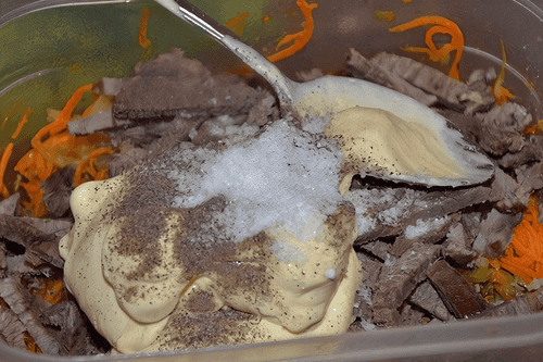 Все посолить, поперчить, заправить майонезом и перемешать.