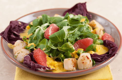 Этот элегантный салат корн с морским гребешком и манговым соусом — олицетворение изысканности французской кухни. Нежные гребешки, обжаренные до золотистой корочки, дополняются сливочным манговым соусом, который придаёт блюду восхитительный баланс сладости и кислинки. Сегменты грейпфрута и лайма добавляют свежесть и лёгкую цитрусовую ноту, а сочетание салатов корн и радиккьо обеспечивает текстурное богатство. Это блюдо идеально подходит для романтического ужина или торжественного мероприятия, впечатляя не только вкусом, но и изысканной подачей. Французы всегда ценили гармонию вкусов, и этот салат — настоящее произведение кулинарного искусства, передающее утонченность их гастрономической традиции.