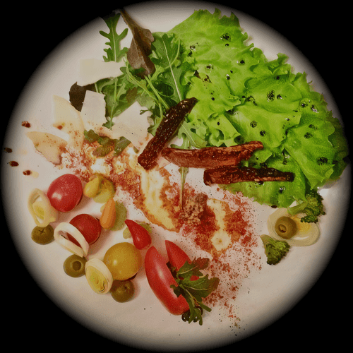Салат в стиле Пикассо — это настоящий шедевр на тарелке, вдохновленный эстетикой великого художника. Югославская кухня славится своим умением сочетать простые ингредиенты, создавая невероятные вкусовые и визуальные композиции. Этот салат — игра текстур и оттенков, где хрустящие листья салата и пикантная руккола встречаются с нежными обжаренными кольцами лука-порея. Освежающие томаты черри закрепляются на каплях бальзамического соуса, а пикантные ноты перца чили добавляют остроту. Вяленые томаты, оливки и тонкие вкрапления пармезана дополняются изысканностью трюфельного масла. Лёгкая горчинка зернистой горчицы делает вкус многогранным, а паприка завершает картину яркими цветами. Этот салат — не просто блюдо, а произведение искусства, которое приятно не только вкушать, но и любоваться.