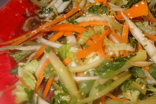 руками перемешиваем с заправкой, посыпаем кинзой и поджаренными семенами кунжута.