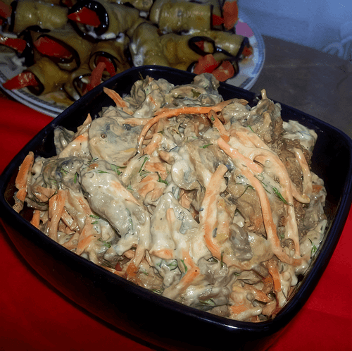 Салат с печенью и корейской морковью — это яркое сочетание нежности и пикантности. Печень, предварительно замоченная в молоке, приобретает мягкость и деликатный вкус, а корейская морковь добавляет приятную остроту и сочность. Грибы придают блюду насыщенность, а свежий укроп освежает композицию. Заправленный майонезом, салат становится гармоничным и насыщенным. Это блюдо отлично подойдет как закуска на праздничный стол или как питательный ужин. Оно не только радует вкус, но и приносит пользу благодаря богатству витаминов и минералов. Салат идеально сочетается с хрустящим хлебом или как самостоятельное блюдо, раскрывающее глубокий вкус ингредиентов.