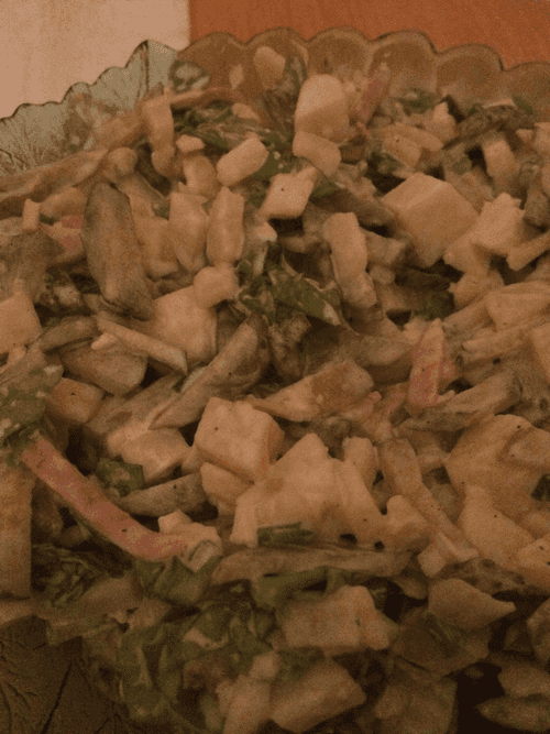 Все ингредиенты перемешать, заправить майонезом, поперчить. Салат поставить в холодильник на один час. Перед подачей украсить луком.