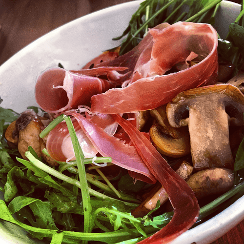 Шампиньоны обжарить, добавить теплыми в салат. Сверху выложить прошутто, полить все лимонным соком.