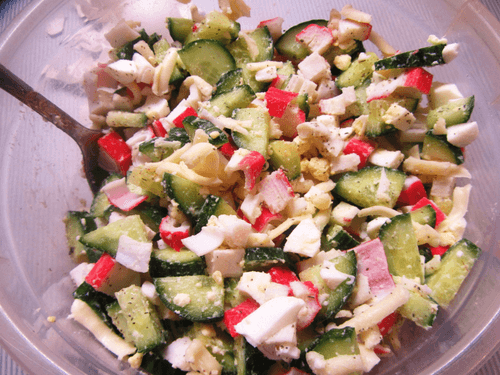Салат из крабовых палочек с огурцом, сыром и домашним майонезом