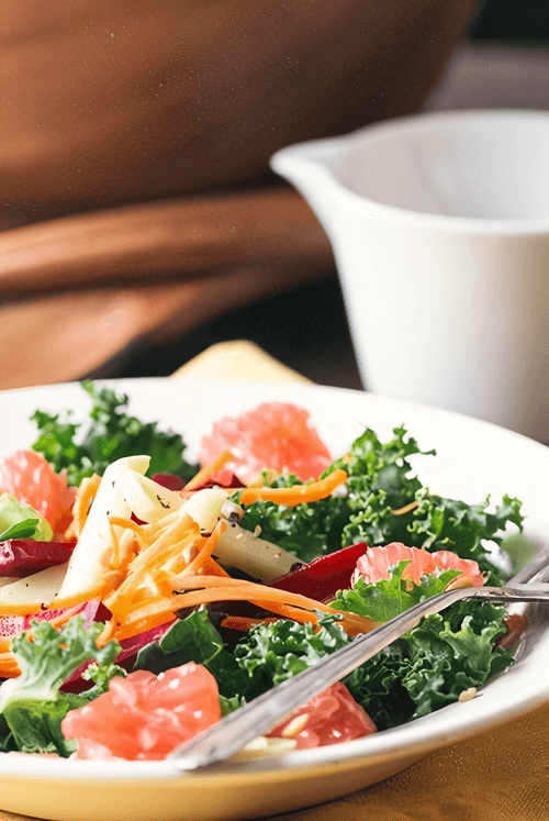 Салат из цикория и грейпфрута с медово-бальзамической заправкой — это гармоничное сочетание свежести и изысканности. Цикорий, известный своим легким горьковатым вкусом, прекрасно дополняется сладковато-кислым грейпфрутом, создавая интересный контраст. Медово-бальзамическая заправка смягчает горчинку цикория и придает блюду насыщенность. Этот салат имеет европейские корни и часто подается как утонченный гастрономический эксперимент, раскрывающий богатство вкусовых оттенков. Легкость и свежесть делают его идеальным для летнего обеда или элегантного ужина. Листик мяты добавляет финальный штрих, превращая обычные ингредиенты в настоящее произведение кулинарного искусства. Прекрасно сочетается с белыми сухими винами и служит отличным дополнением к рыбным блюдам.