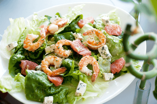 Салат с креветками, грейпфрутом и мятной заправкой