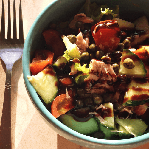 Салат с тунцом и каперсами – это воплощение средиземноморской элегантности в простом, но изысканном блюде. Легкость свежего зеленого салата и сочных черри гармонично сочетается с насыщенным вкусом тунца, дополненного пикантными нотками маринованных каперсов. Бальзамический соус обогащает композицию изысканной кисло-сладкой глубиной, а огурцы добавляют освежающую хрусткость. Истоки этого салата уходят в традиции средиземноморской кухни, где ценят натуральные продукты и баланс вкусов. Он идеален как легкий обед или изысканная закуска, а также подходит для тех, кто следит за питанием, стремясь к здоровому и вкусному рациону.