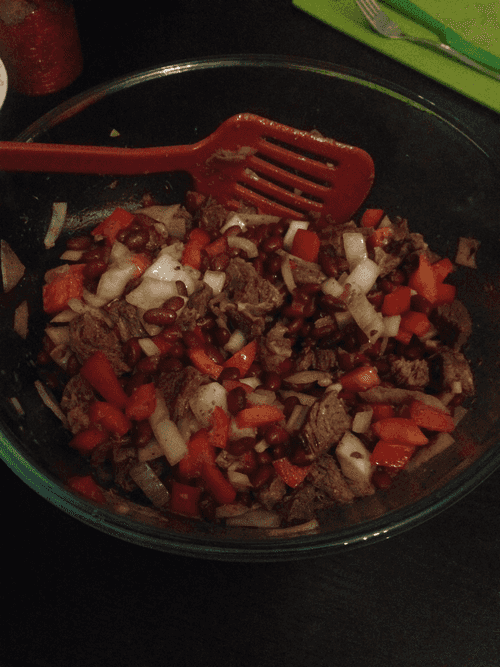 Смешиваем фасоль, лук, говядину, перцы, чеснок, нарезанную кинзу, обжаренные и мелко порубленные грецкие орехи.