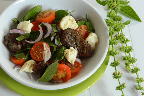 Куриную печенку зачистите от сгустков крови и жира. Нарежьте крупными кусочками. Помидоры черри разрежьте пополам, красный лук нашинкуйте соломкой.